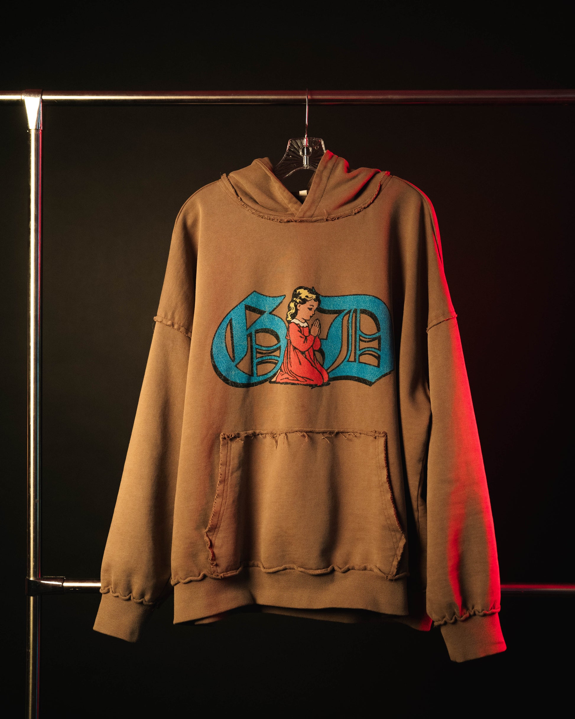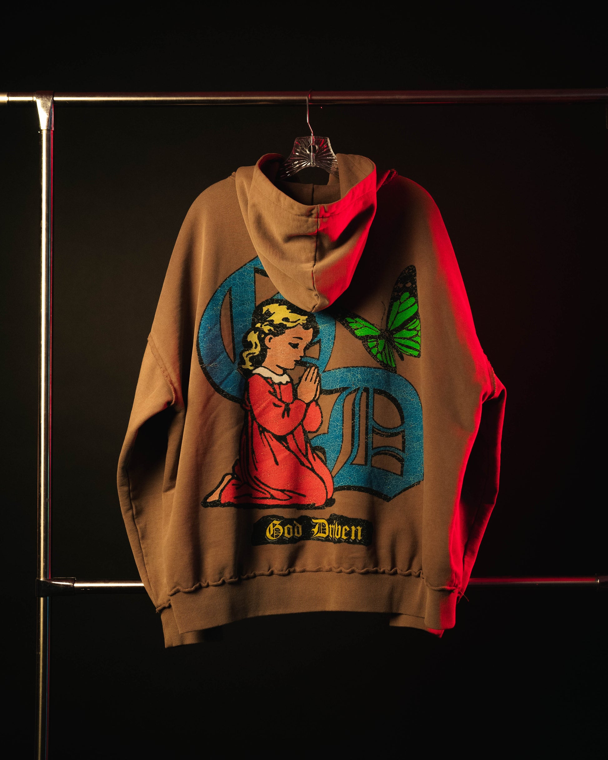 Finished in a custom washed brown, this hoodie carries raw-edge seams, distressing details, and DTG artwork that represents the heart of our mission: